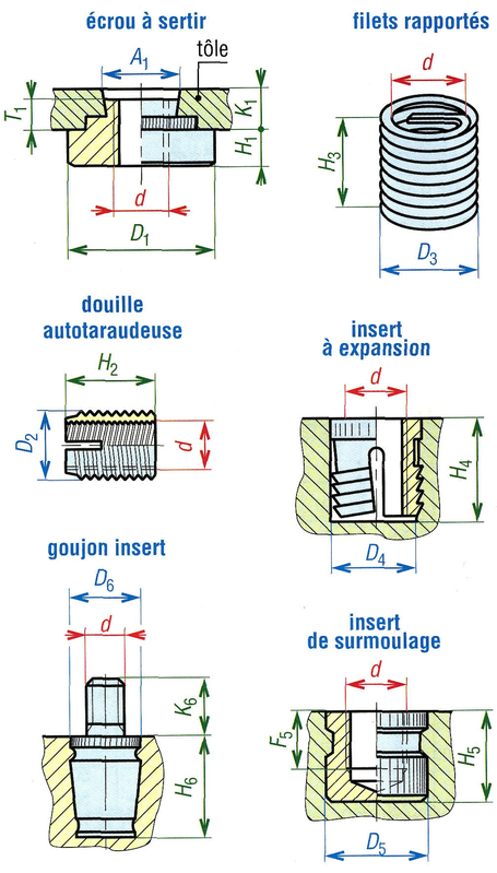 Dimensions de quelques écrous rapportés et inserts.