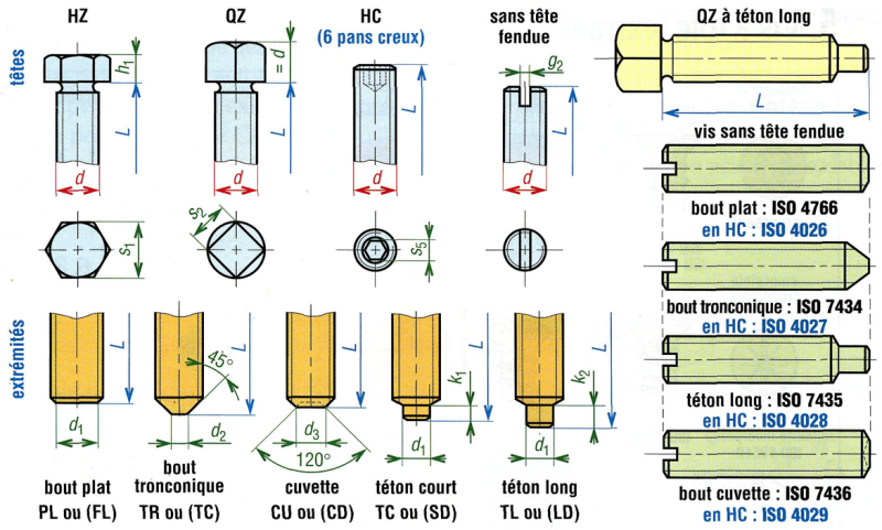 NFE 25-133 : tête HZ + bout TL ; NFE 25-134 : tête QZ + bout TC ; NF EN ISO 4028 : sans tête HC + bouts TC et TL ; NF EN ISO 4027 : sans tête HC + bout TR ; NF EN ISO 4026 : sans tête HC + bout PL ; NF EN ISO 4029 : sans tête HC + bout CU.