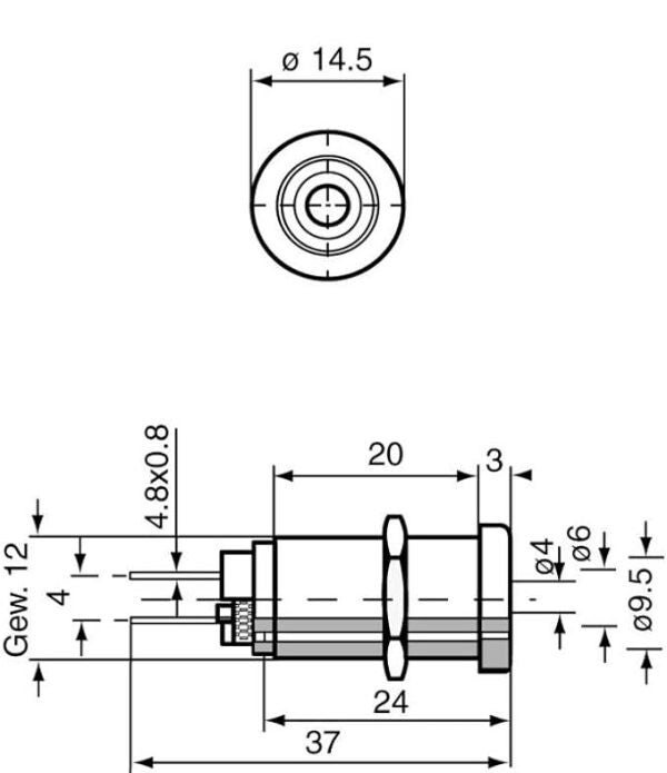 Prise femelle a deux lames qui se connectent électriquement lorsqu'une fiche mâle de 4 mm protégée est insérée. Fournie avec un écrou de fixation M12.