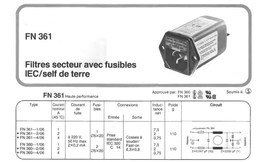Courant de fuite à 220 V/50 Hz: 2 x 0.2 mA