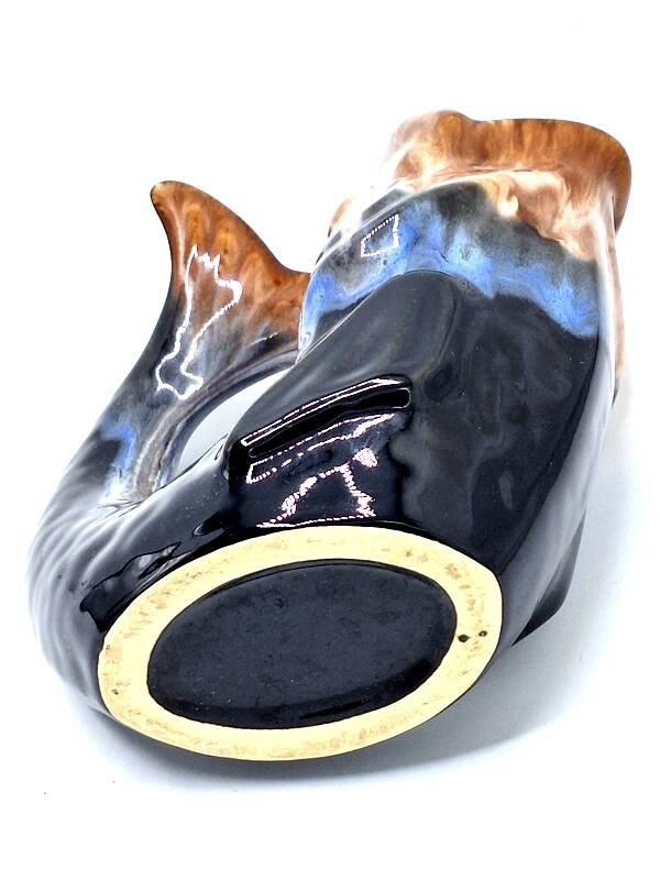 Faïence au décor polychrome de grand feu Vase en forme de poisson Décor polychrome (dominente bleu). Dimensions: - Hauteur: 20 cm - Diamètre: 10 cm - Largeur: 18 Contenance : 1 litre